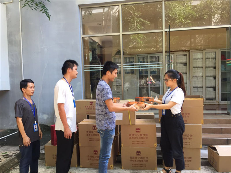 (圖上為行政人事部向員工分發(fā)月餅)
